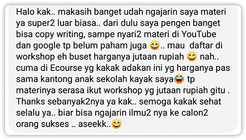 Dikursus online ini tuh enak, bisa belajar ilmu copywriting dari nol, dapat puluhan tips nulis iklan, ilmunya praktis, gak perlu bayar mahal lagi.